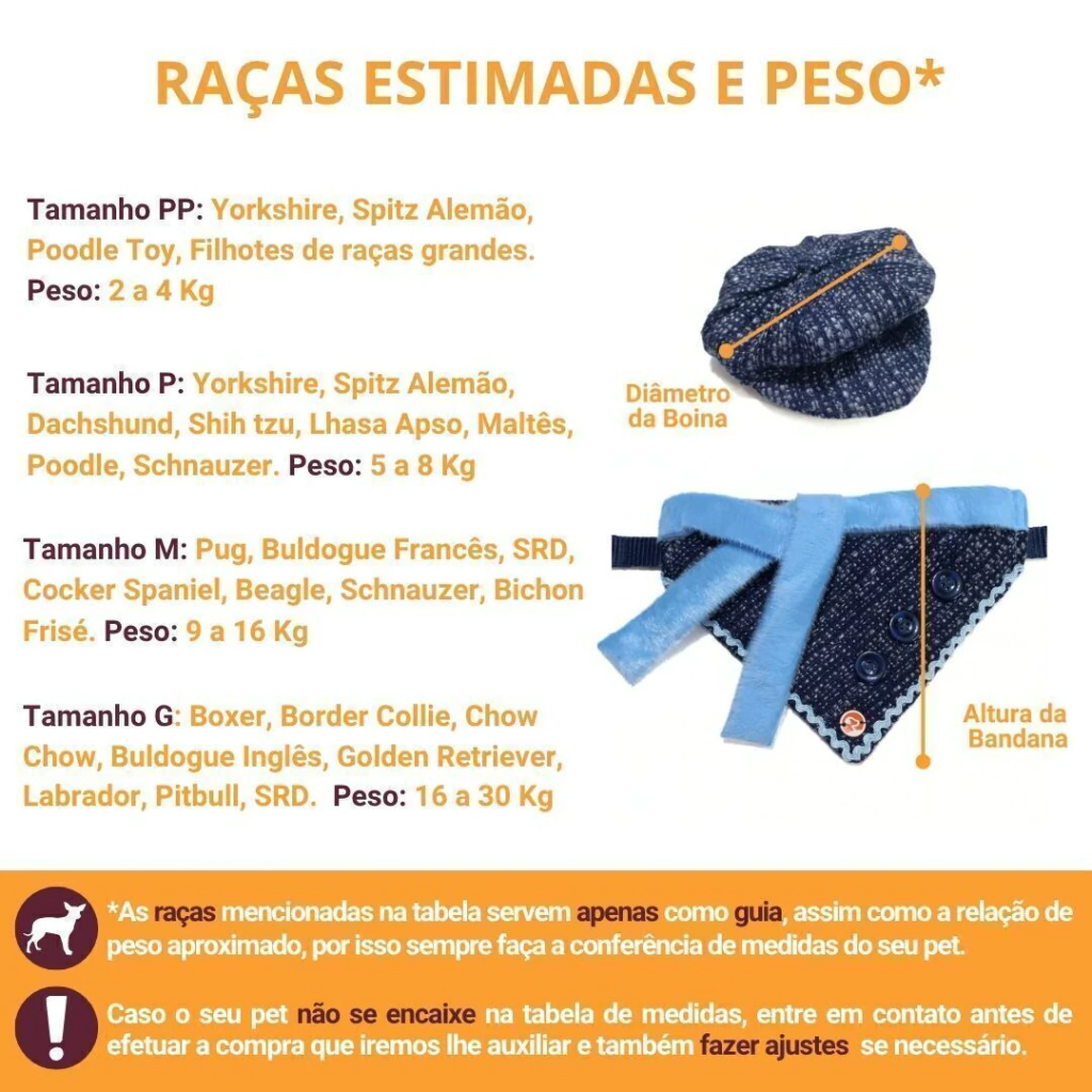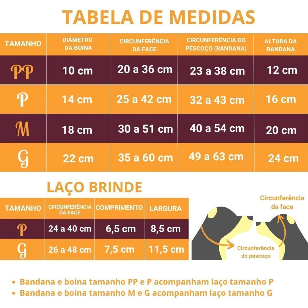 A bandana está disponível em 4 tamanhos diferentes, tamanho PP, serve em pets de pequeno porte. Tamanho P, serve em pets de pequeno e alguns de médio porte. Tamanho M, serve em pets de médio porte. Tamanhos G, serve em pets de grande porte.