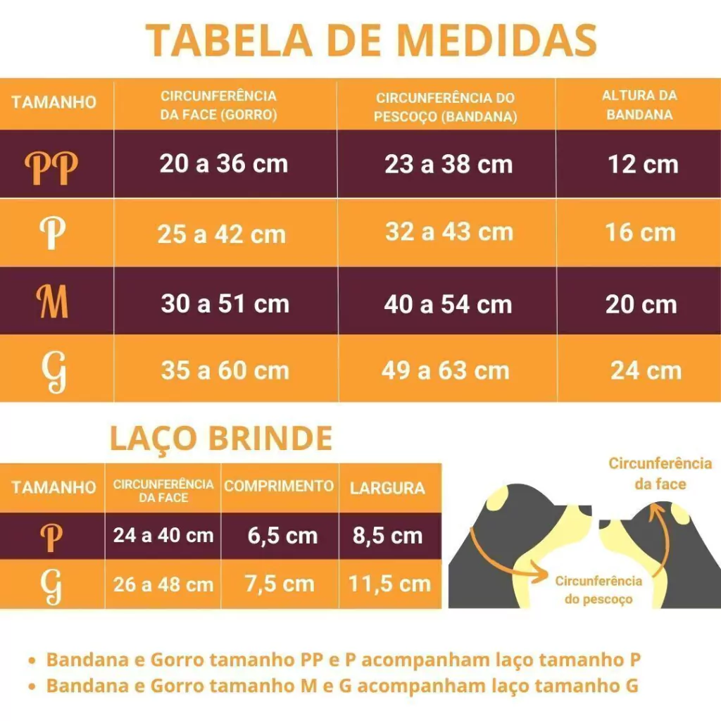 Se as medidas do seu pet, ficarem muito próximas ou iguais à medida máxima de um dos tamanhos, escolha o tamanho maior.