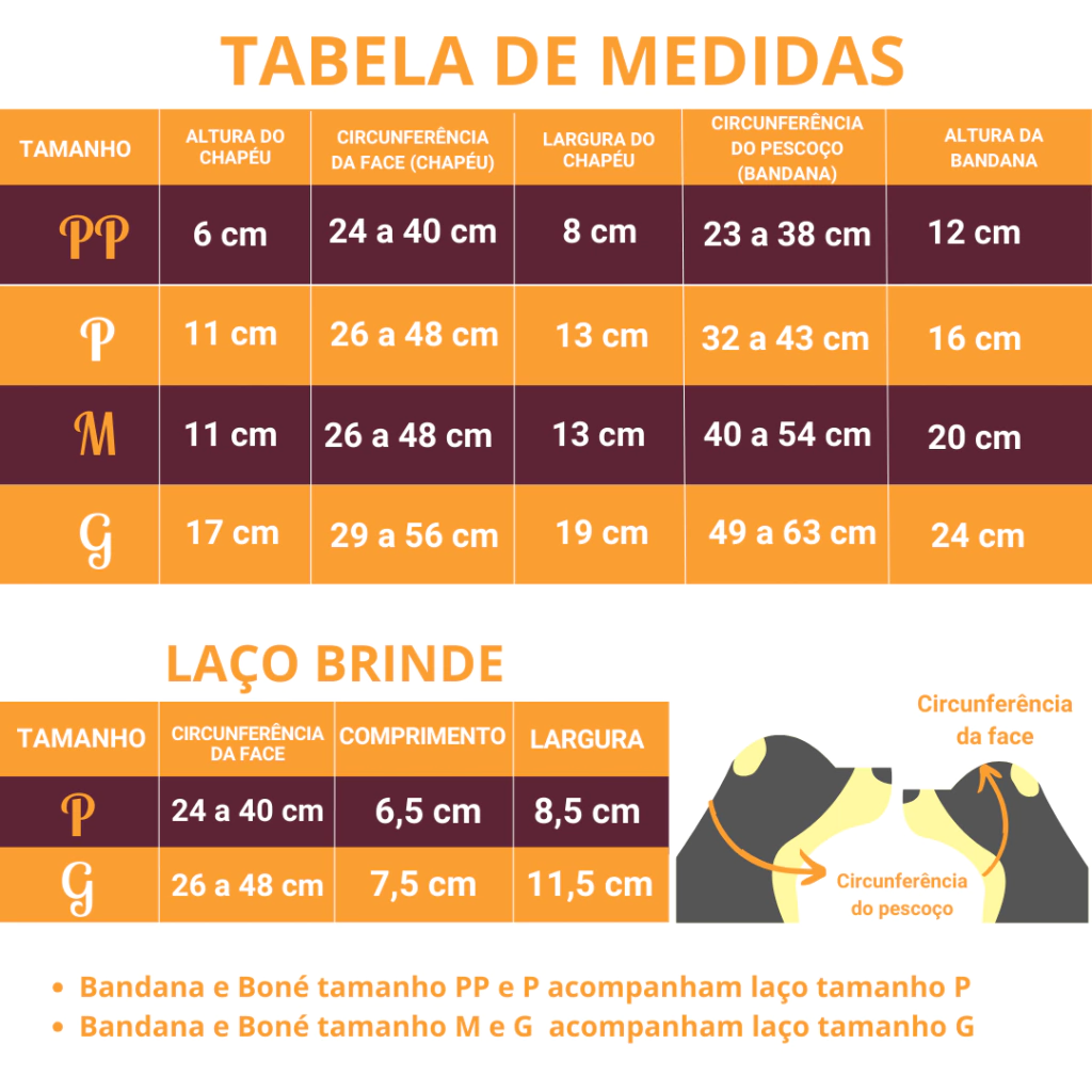 A bandana está disponível em 4 tamanhos diferentes, tamanho PP, serve em pets de pequeno porte. Tamanho P, serve em pets de pequeno e alguns de médio porte. Tamanho M, serve em pets de médio porte. Tamanhos G, serve em pets de grande porte.