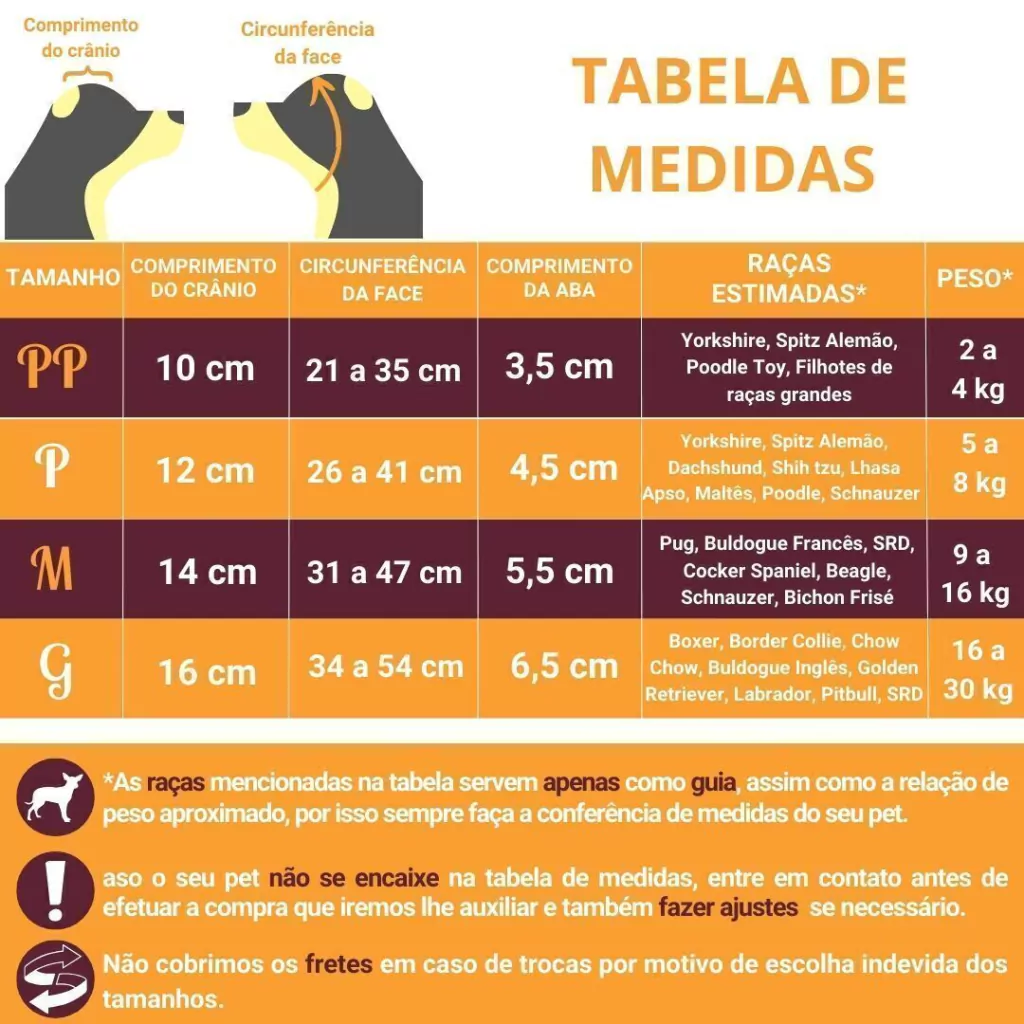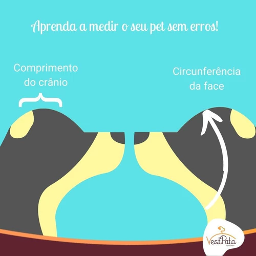 É necessário tirar as medidas justas do seu pet da circunferência da face e comprimento do crânio, como mostrado no campo das imagens do anúncio.