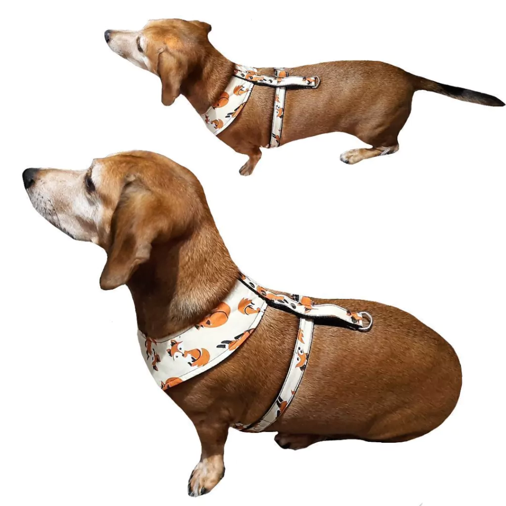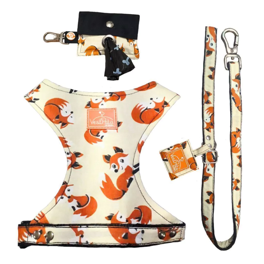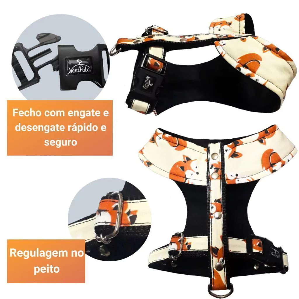 Kit Coleira Peitoral Pet Com Regulagem Guia E Cata-Caca Estampa Raposa
