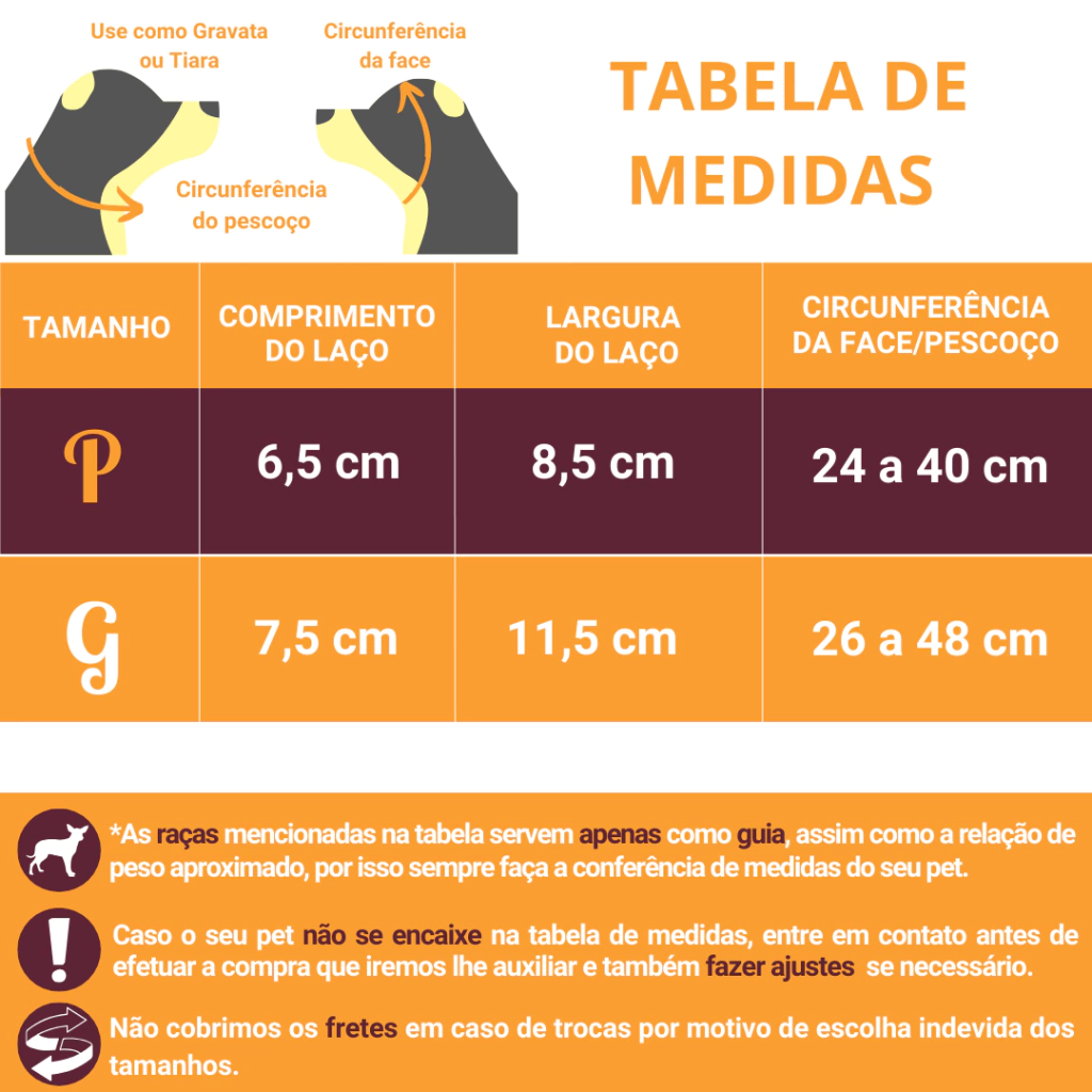 O Laço está disponível em 2 tamanhos diferentes, tamanho P, serve em pets de pequeno porte e alguns de médio porte. Tamanho G, serve em pets de médio porte a pets de grande porte.